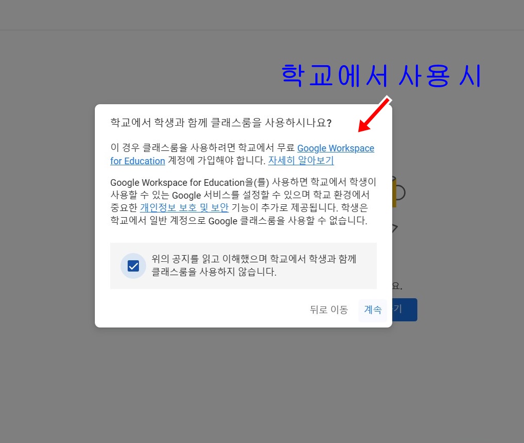 수업만들기를 클릭화면 위와 같은 화면이 나오는데, 학교에서 사용 시 "Google Workspace for Education"에 가입을 필요로 한다. 만약 개인이라면 "계속"을 누르고 수업 만들기를 진행하면 된다. 이번에는 학교와 학생 사이의 수업을 만들기 위해 Google Workspace for Education에 가입을 진행해 본다.
