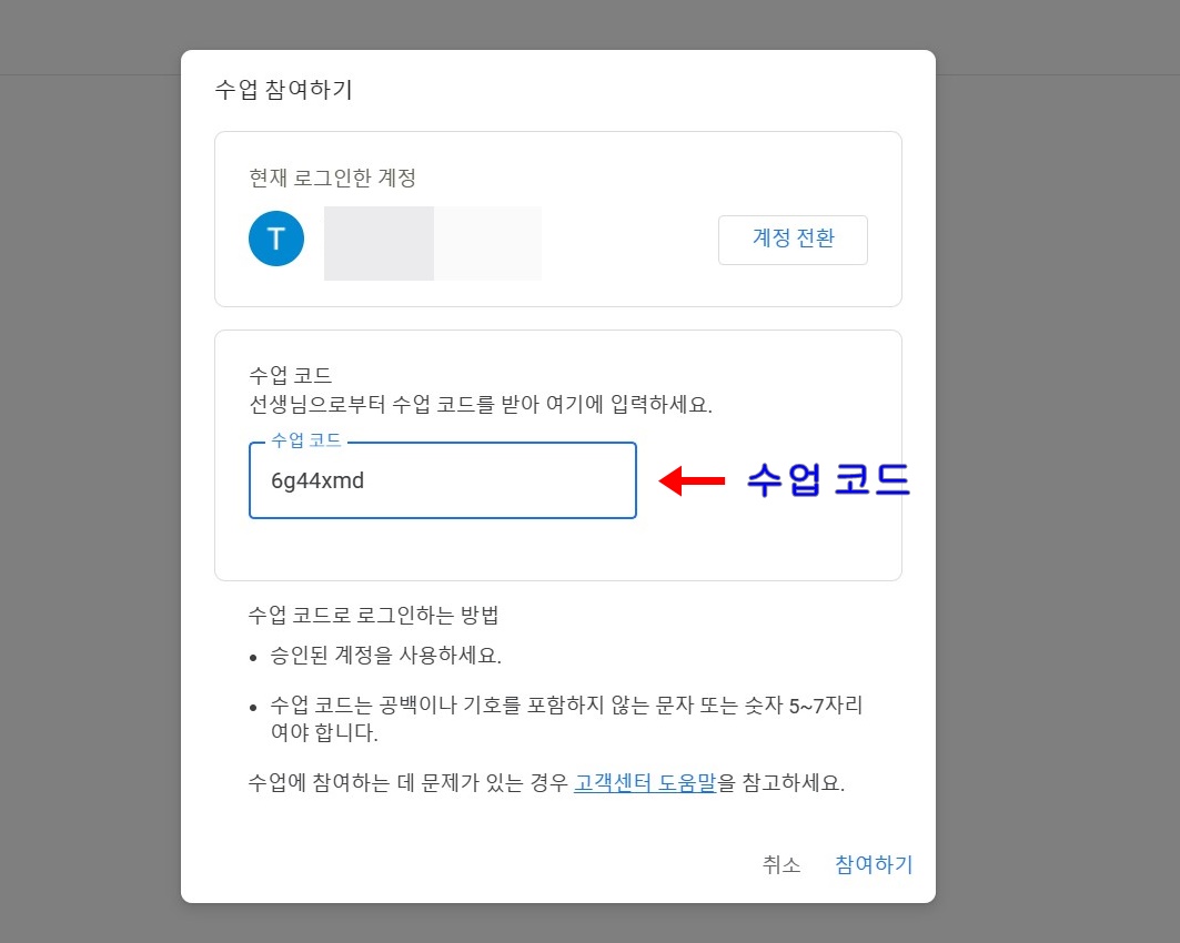 수업 참여를 클릭하고 수업코드 입력을 해주자.