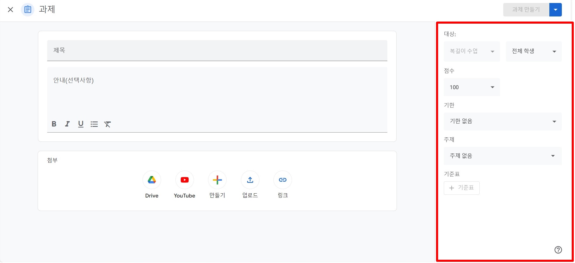 또한 여기서 어떤 학생에게 과제를 줄 것인지, 점수 설정, 기한, 주제 등을 설정할 수 있다.