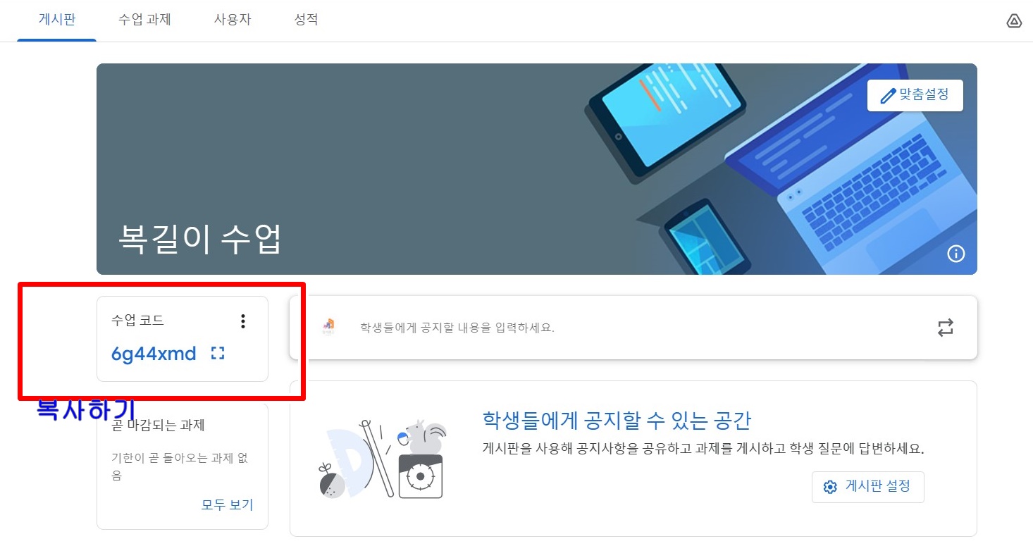 수업을 만들면 위와 같은 화면이 나오는데, 학생들이 이 수업을 참여하기 위해서는 코드를 입력해야 하므로 메신저, 휴대폰, 이메일 등으로 코드를 공지하길 바란다.