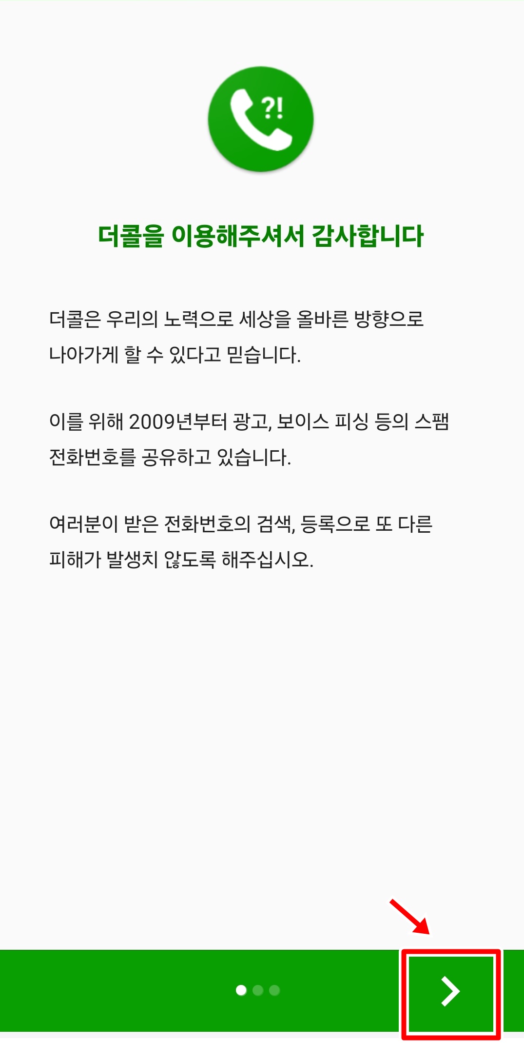 첫 화면에 더 콜의 소개글을 확인한 후 오른쪽 하단에 화살표 모양을 클릭합니다.
