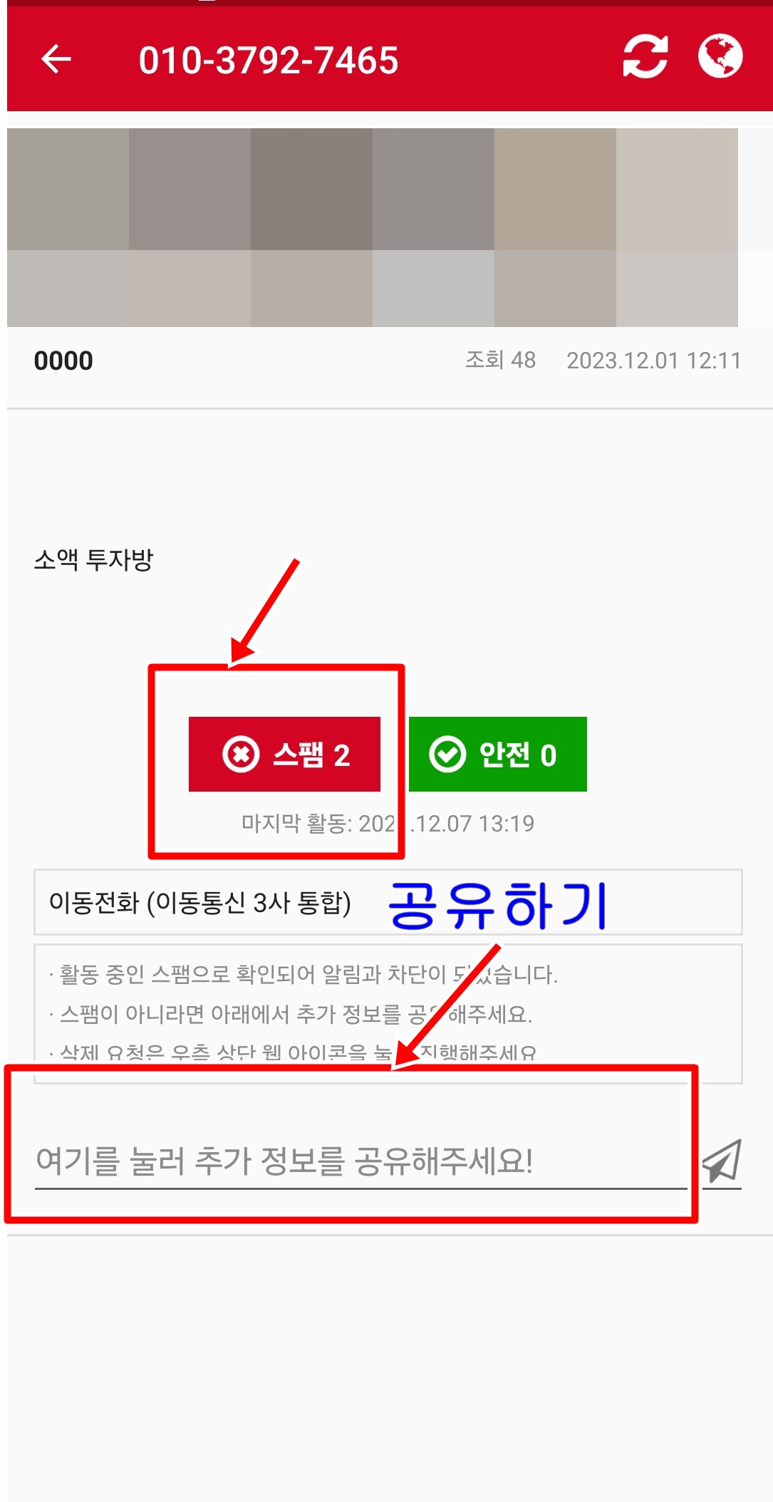 자신이 받은 문자나 전화가 스팸이 맞다면 빨간색 [스팸]을 클릭해 주고 아래에 어떤 내용인지 추가를 해서 더콜 스팸 전화번호부에 추가해 주시면 됩니다.