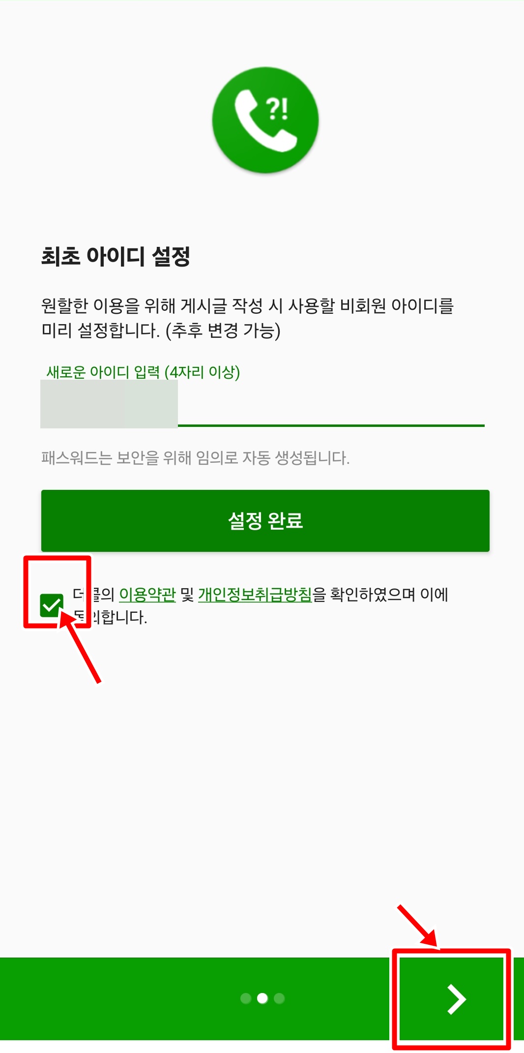먼저 아이디를 작성해줍니다. 추후 변경이 가능하니 너무 고민하지 말고 까먹지 않을 아이디로 적어주시고 [이용약관 및 개인정보 취급방침]에 동의하기를 체크한 후 오른쪽 하단의 화살표를 누릅니다.