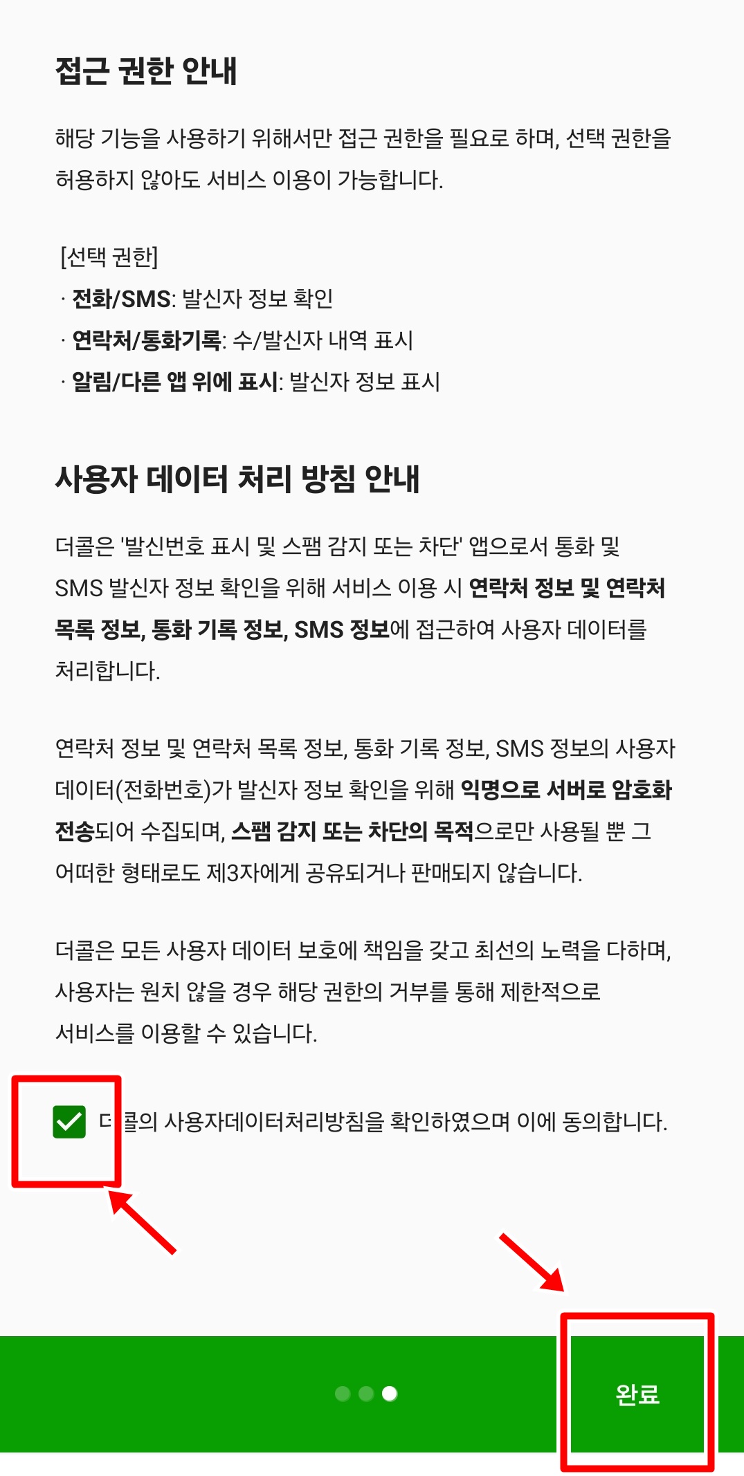네모박스 [사용자데이터처리방침]에 확인하고 동의하기를 체크한 후 완료를 눌러주세요.