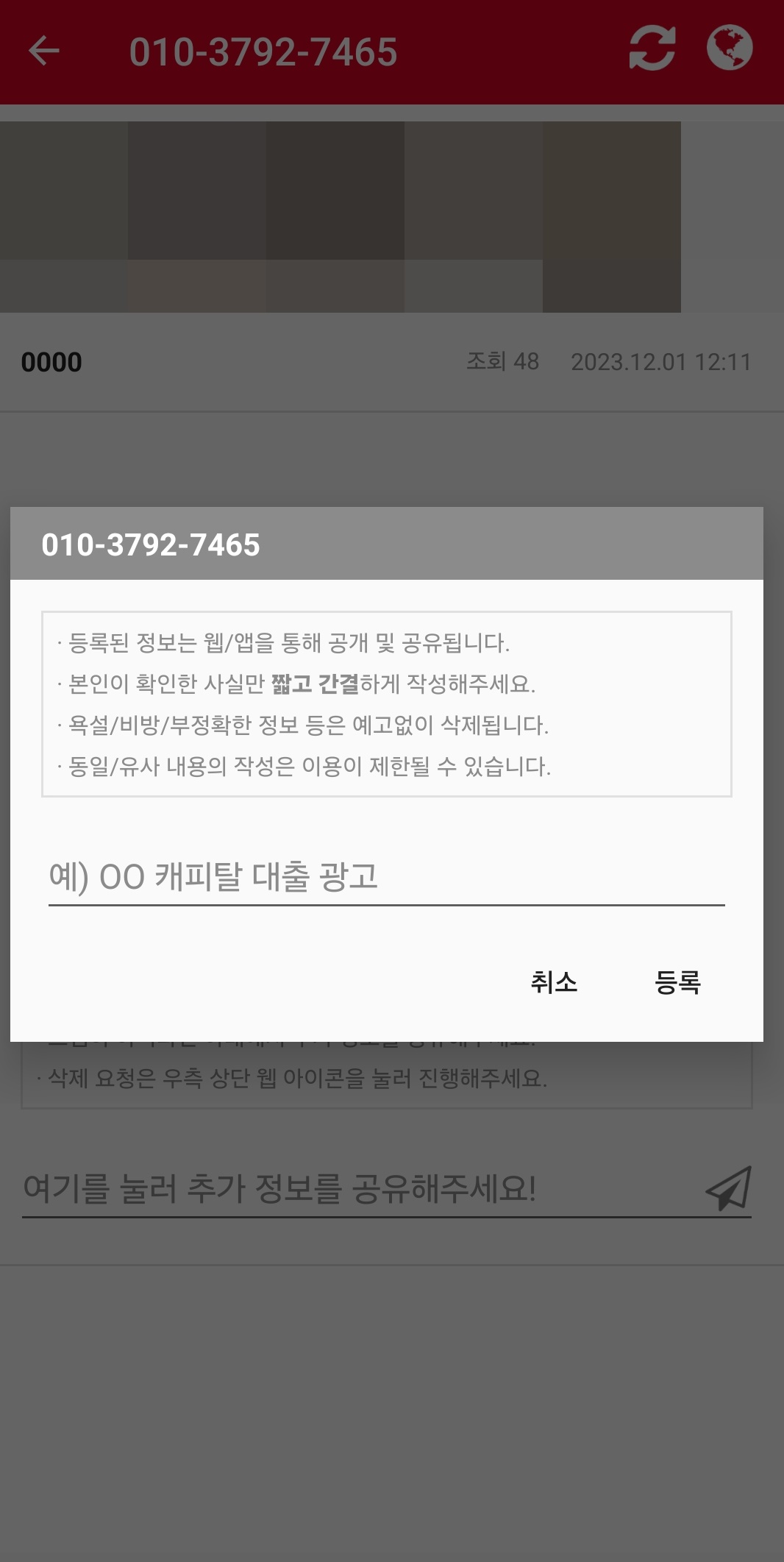 더 콜 전화번호 검색했는데 위와 같이 등록되지 않는 번호가 나올 수도 있습니다. 자신이 받은 문자나 전화의 내용을 적어서 여러 사람들과 공유할 수 있습니다.