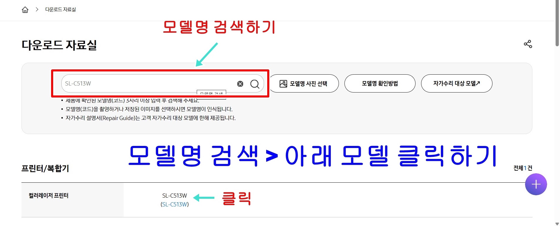 다운로드 자료실에 들어오시면 모델명을 입력할 수 있는 검색 칸을 확인할 수 있는데요, 먼저 프린터 모델명을 입력한 후, 우측의 검색(돋보기 모양)을 클릭하시거나 엔터를 눌러줍니다. 그 후 아래에 자신의 모델명을 확인하시고 클릭하시면 됩니다. 혹시 제품 모델명을 확인하기 어려우신 경우, 모델명 사진 선택이나 모델명 확인방법을 제공하고 있어서 참고하시길 바랍니다.