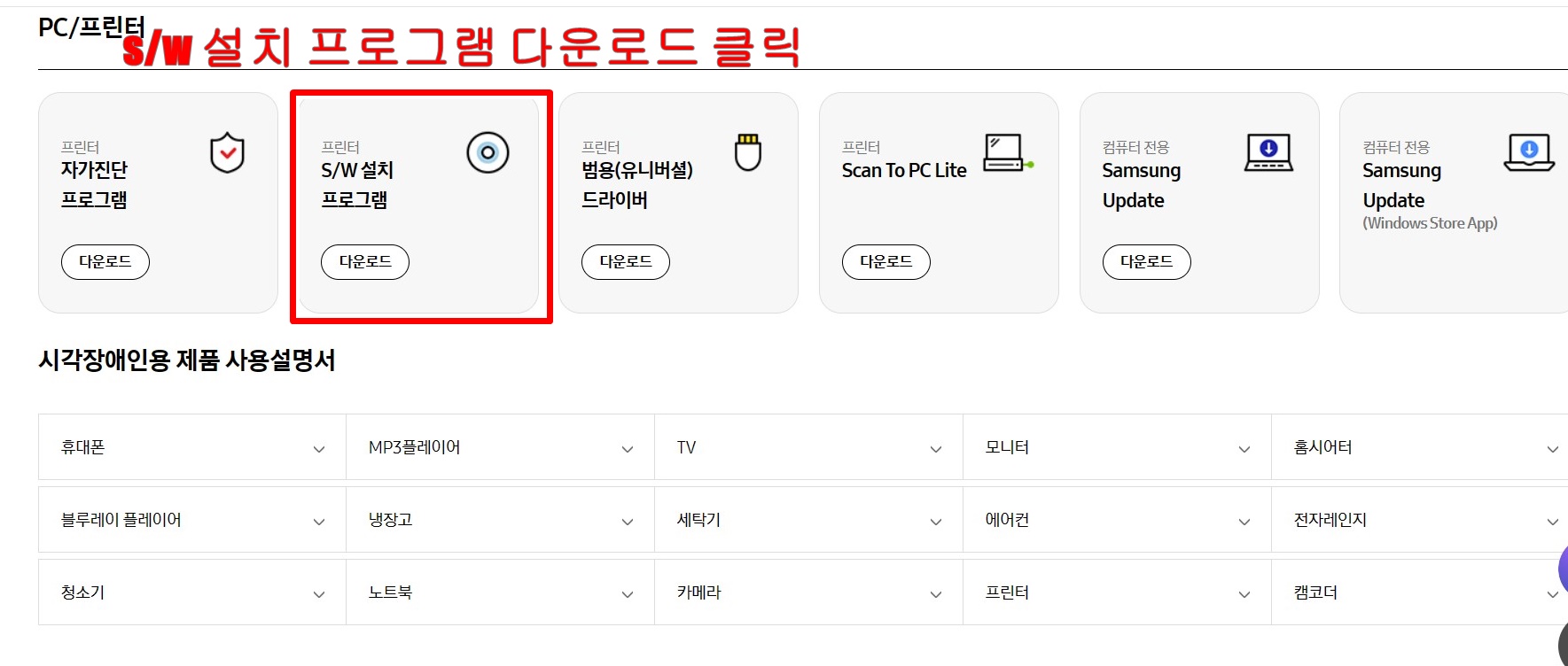 만약에 모델명을 모르거나 검색을 해도 도저히 찾기 어려우신 분들은 프린터 S/W 설치 프로그램을 다운로드하셔서 설치하시면 됩니다. 이 방법 또한 매우 간단하고 쉬워서 한번 따라 해보세요.