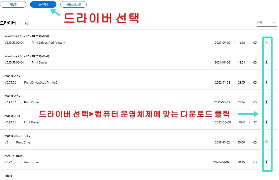 이후 본인에게 맞는 운영체제를 확인하시고 우측에 작은 크기의 다운로드 버튼을 눌러 삼성 프린터 드라이버를 설치하시면 됩니다.
