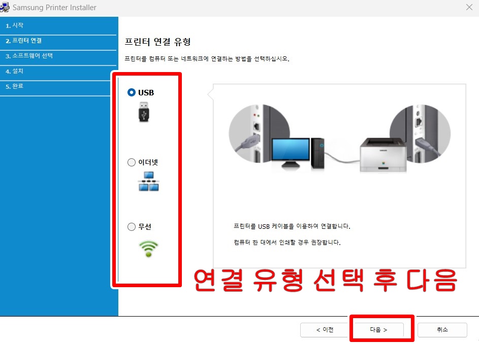 5. 사용하는 연결 유형(usb케이블, 네트워크, 와이파이) 선택 후 다음 클릭