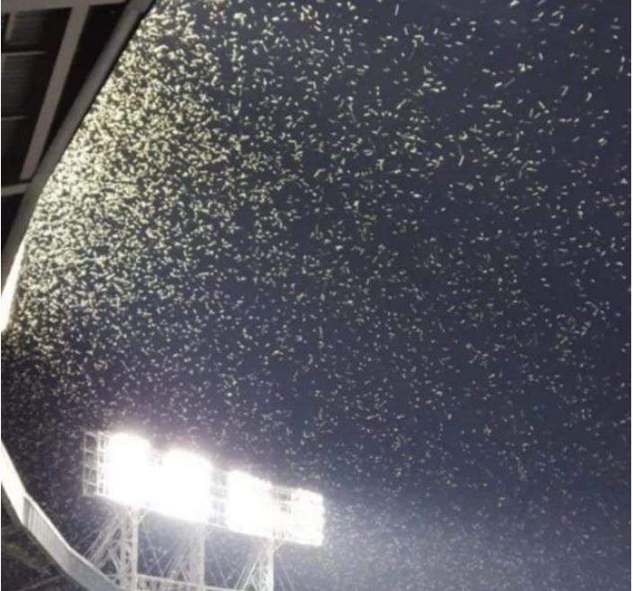 잠실구장의 밝은 불빛을 보고 모인 것으로 추측됩니다. 관중석에도 몇백 마리씩 떨어져 관중들은 불편함을 얘기했다.
