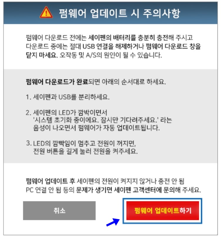 최신 펌웨어 업데이트 이후에 세이펜의 이상이 있을 경우 세이펜 고객센터에 문의를 통해 도움을 받을 수 있습니다.
