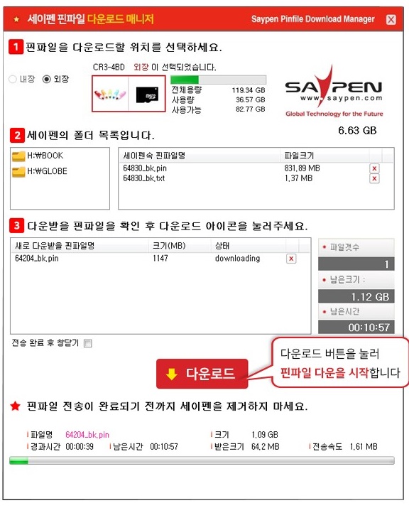 세이펜 음원다운로드 시 많은 배터리가 필요하기 때문에 미리 충전을 하신 후에 다운로드를 진행하시기 바랍니다. 중요한 파일이 있다면 미리 백업해 두세요.