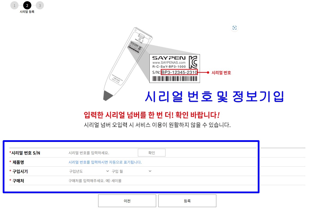 이후 시리얼번호, 제품명, 구입시기, 구매처를 적는 칸이 나오는데요, 구입시기와 구매처는 자신이 산 곳을 적으면 됩니다. 만약 기억이 나지 않는다면 '기억 안 남'이라고 쓰셔도 무방합니다. 단, 시리얼번호는 정확하게 기입을 하셔야 합니다. 세이펜 뒷면에 S/N이라고 적힌 부분에 숫자를 정확히 기입하시고 확인 후 등록을 진행해 주세요.