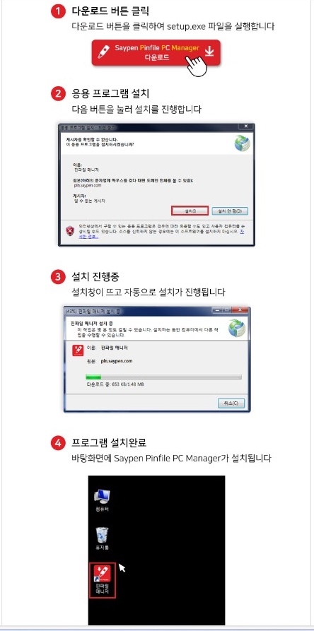 다운로드 후에 응용 프로그램 설치를 클릭하시면 자동으로 설치창이 뜨고 설치가 진행됩니다. 설치가 완료되면 바탕화면에 Saypen Pinfile PC Manager가 설치되어 이후에는 편하게 바로 접속이 가능합니다.