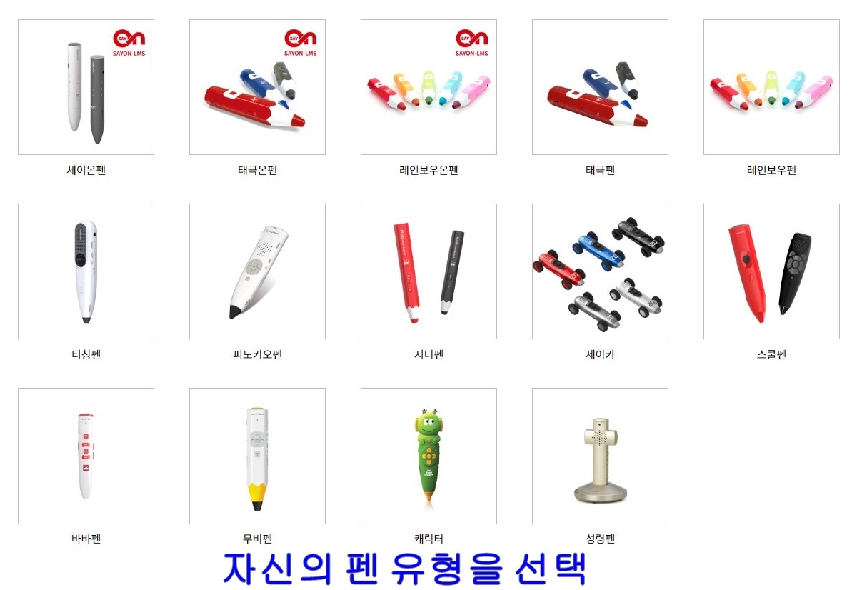 제품등록을 클릭하면 세이온펜, 태극온펜, 레인보우펜, 티칭펜, 지니펜, 피노키오펜 등 많은 종류가 나오는데요, 이 중에 자신이 가지고 있는 펜을 선택해 주시면 됩니다. 저는 피노키오펜을 가지고 있어서 피노키오펜을 선택해 보겠습니다.