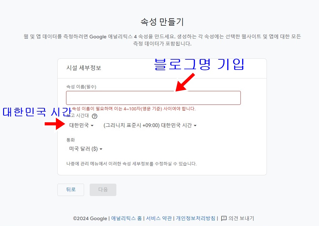 속성이름도 임의대로 정할 수 있지만 추후 여러 개의 블로그를 운영할 때 체계적으로 구분할 수 있도록 블로그명을 적으시길 추천합니다. 보고 시간대는 대한민국으로 기입하시면 됩니다.