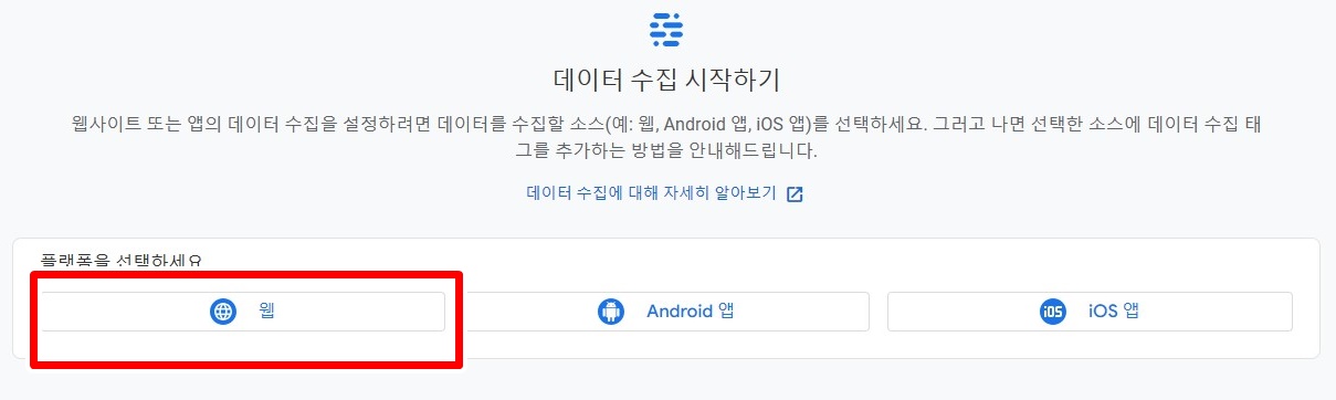 가입 이후 데이터 수집 시작하기라 화면이 나오게 되면 웹을 체크하시면 됩니다.
