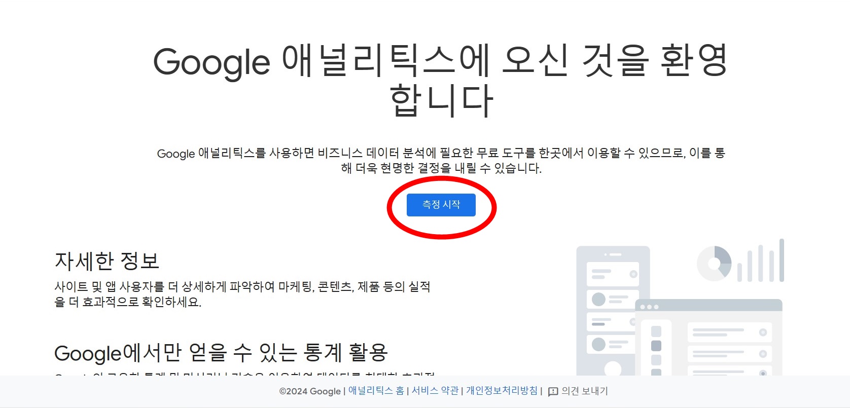 구글 애널리틱스에 접속 후 바로 측정 시작을 눌러줍니다.