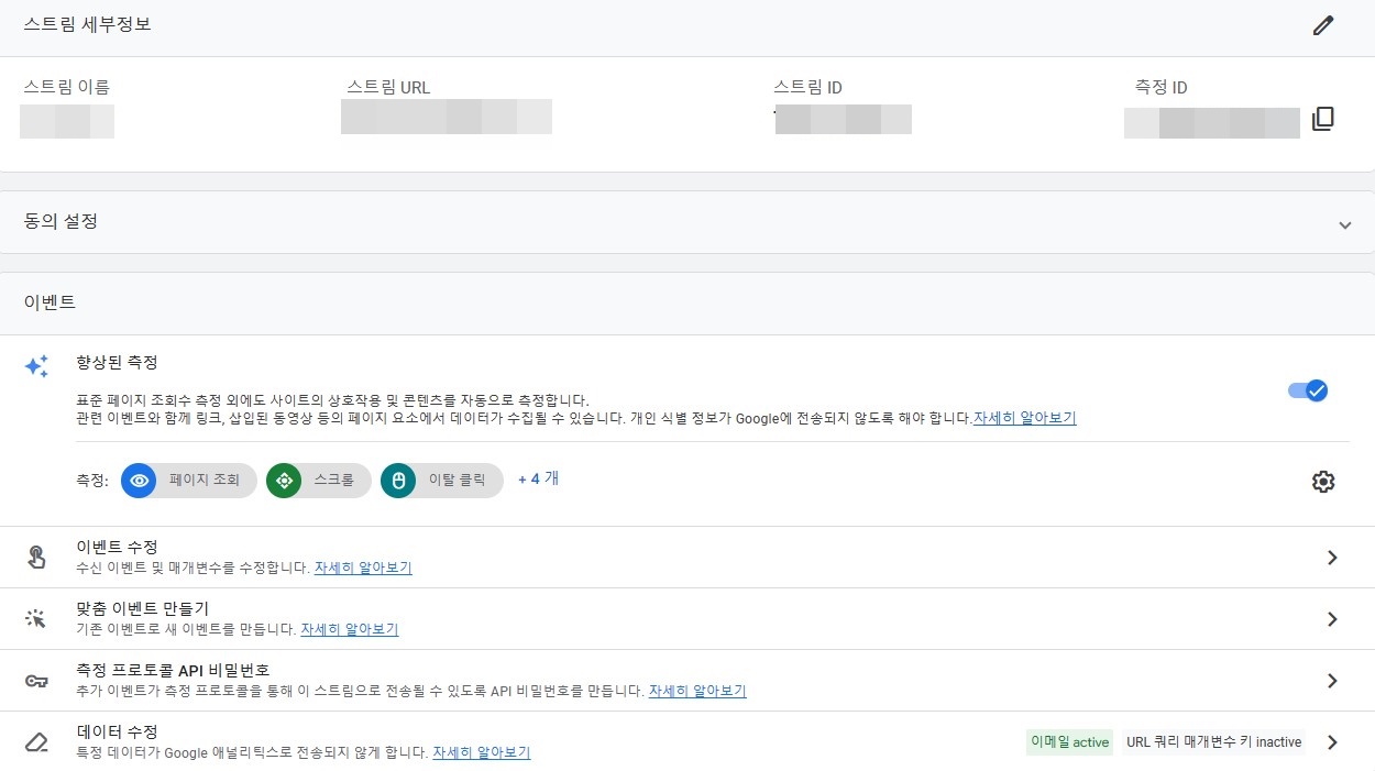 스트림 만들기 클릭 후 세부정보에서 측정 ID값을 복사합니다.