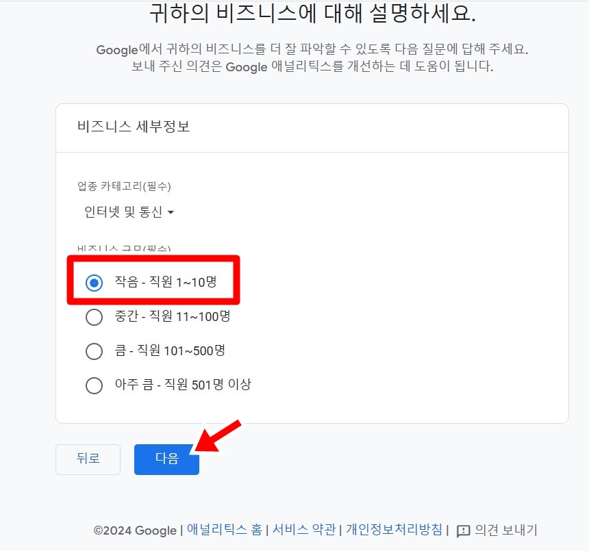 업종 카테고리에는 인터넷 및 통신을 선택해 주고 블로그 운영은 규모를 작음으로 선택하면 됩니다.
