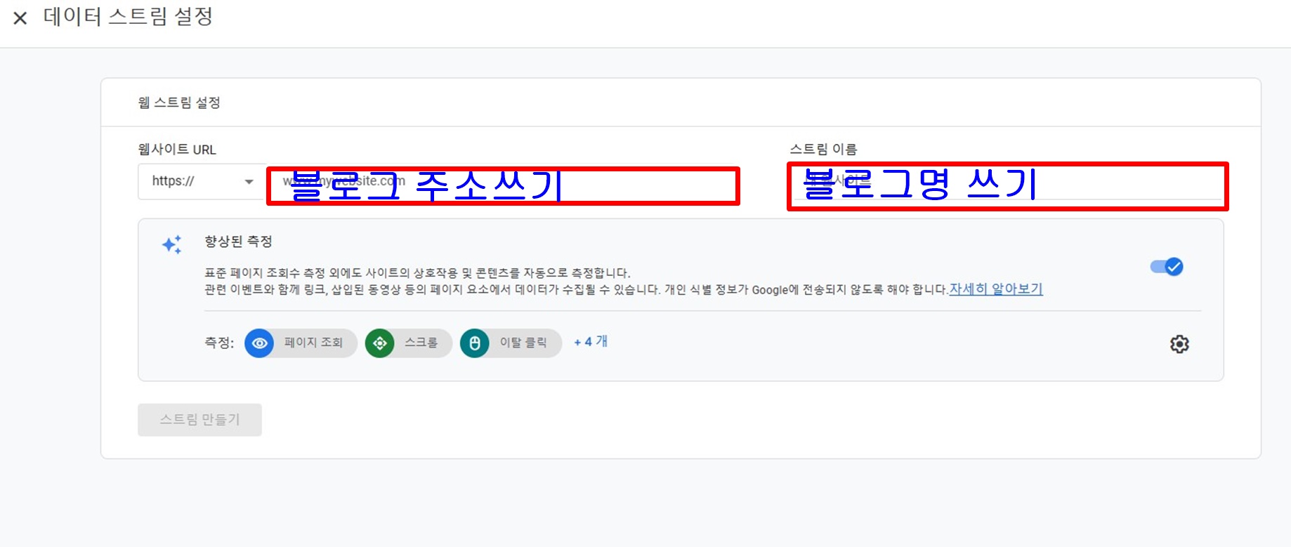 웹을 선택한 후 자신의 블로그 주소와 블로그명을 적어주고 스트림 만들기를 클릭하면 됩니다.