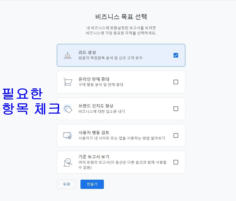 비즈니스 목표는 자신의 블로그에 가장 필요한 항목을 설정하면 되는데 복수가 아니라 가장 중요한 하나만 체크할 수 있으니 신중하게 선택하시길 바랍니다
