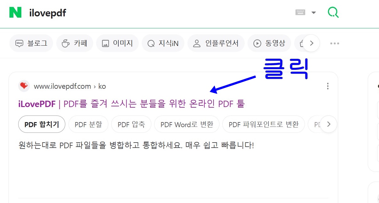 먼저 'iLovePDF'를 검색하고 클릭해서 홈페이지로 접속해 줍니다. 예전에는 영어로 처음 들어가면 영어로 되어 있어서 사용이 불편했는데 지금은 한글지원이 돼서 번역 없이 바로 사용하시면 됩니다.